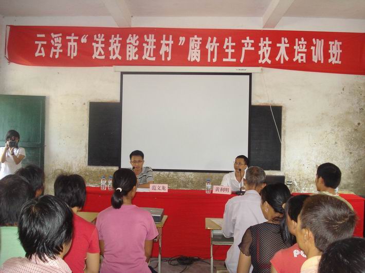 为积极响应省委、省政府关于促进农村劳动力就业和农民增收的号召,学习先进腐竹生产技术,改善传统腐竹工艺,821日上午,云浮市“送技能进村”腐竹生产技术培训班在石城镇云星小学举行。市、县劳动保障局和石城镇有关领导,有关村党员干部以及从事腐竹行业的生产商约150人参加了培训。