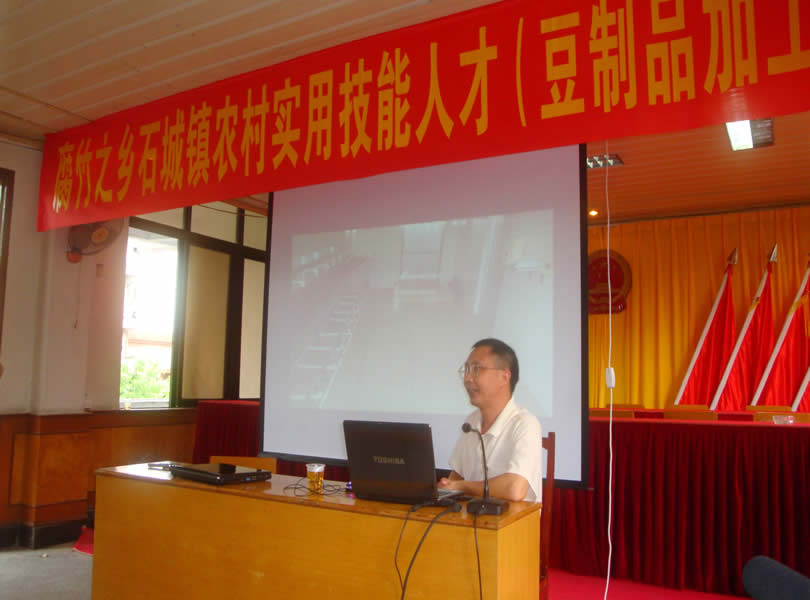 培训班邀请了广东江门食品工程师黄利明教授进行主讲,他表示,石城镇托洞腐竹具有一定知名度,但生产技术相对落后,还停留在传统的生产水平,距离国际标准还有一段距离,要提高生产效率,占有一定的市场份额,学习先进的生产技术已成为时代的要求。他以深入浅出、通俗易懂的语言,全面系统、详细地介绍了从事腐竹生产的各项技术:从如何筹建一个符合QS要求的腐竹厂开始,到各种生产设备、配套设施的如何合理布局;从如何选购黄豆、烘干、脱皮、浸豆、磨浆、过滤、煮浆、挑腐竹,到烘干和包装等生产技术;从生产设备的如何正确操作使用,到如何维护保养;从各类生产设备优缺点讲起,到如何正确选购符合当地的实际情况,以最经济的手段改造目前落后的生产设备;从如何做好个人卫生到如何搞好食品质量安全等内容等,他强调要提高生产效率必须要有先进的设备,必须机械化生产,先进的技术依靠先进的设备,提升腐竹产品的档次,并向大家展示了黄豆脱皮机、磨浆机和电动摇浆机、高效节能腐竹机等等。同时他还表示在依靠先进技术的同时必须扩大生产规模,使托洞腐竹走上一条现代化、产业化、规模化的发展道路。